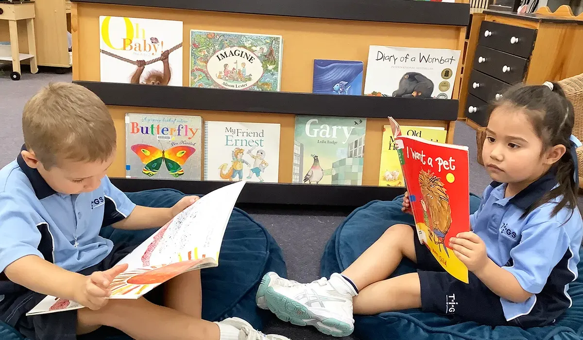 In each Prep classroom, educators create Reggio-inspired children’s library spaces. These are comfortable areas with an enticing variety of books. These spaces give children an opportunity to explore new genres of books and provide them with the opportunity to practice their book handling skills (for example holding the book correctly, turning the pages over from the top corner and looking at the words from left to right).